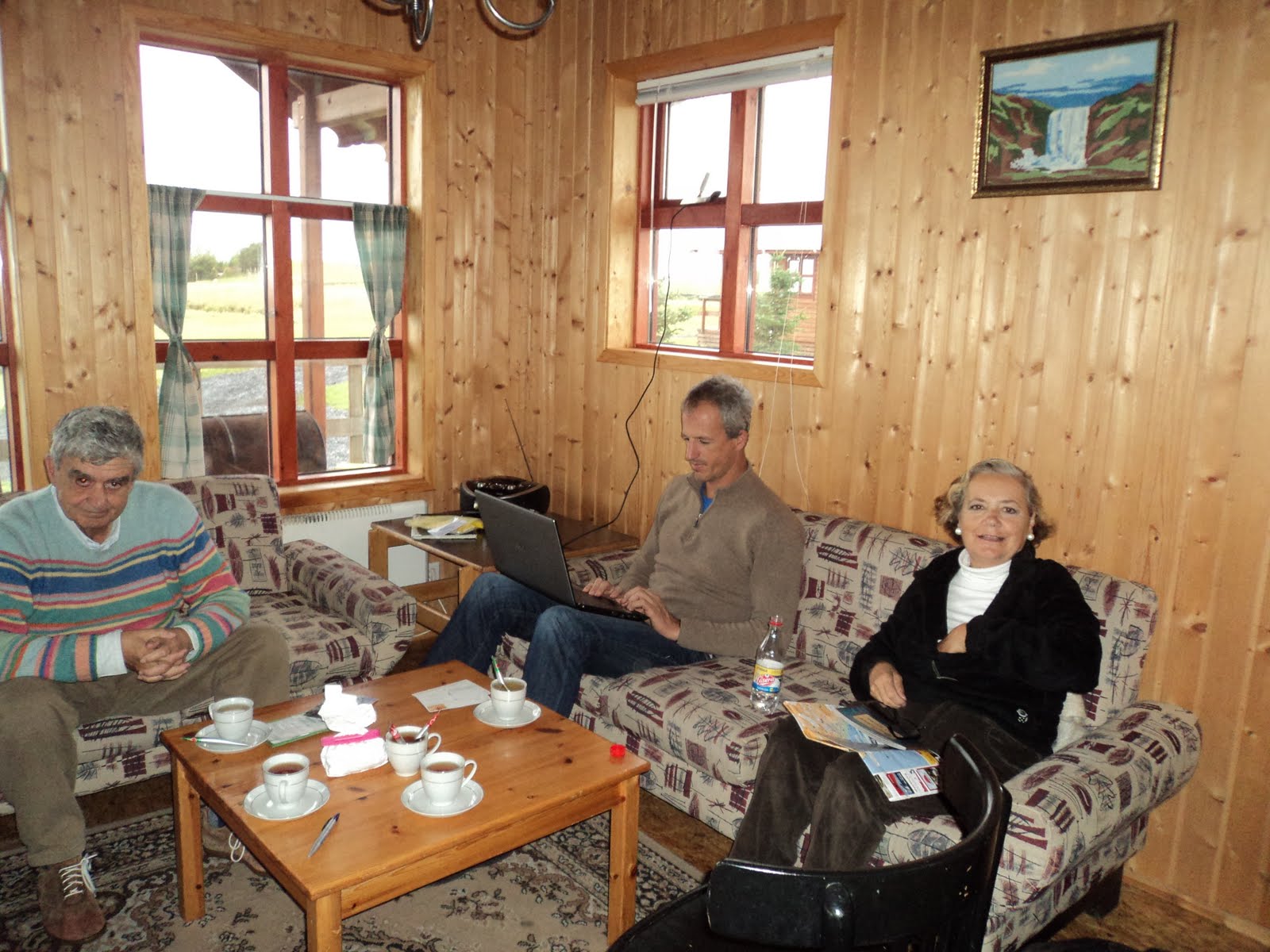 Llevábamos en el coche provisiones varias compradas en Reykiavik y, con ellas, nos hacíamos el desayuno, comíamos de pícnic y, por la noche, en la cabaña, refugio o albergue, tomábamos manjares que cocinaba el grupo, especialmente Marusa, cuyo saber fue asombroso- cada día nos hacía un plato distinto y delicioso- y Alfonso, que hizo unas estupendas barbacoas, de salmón. y de cordero.